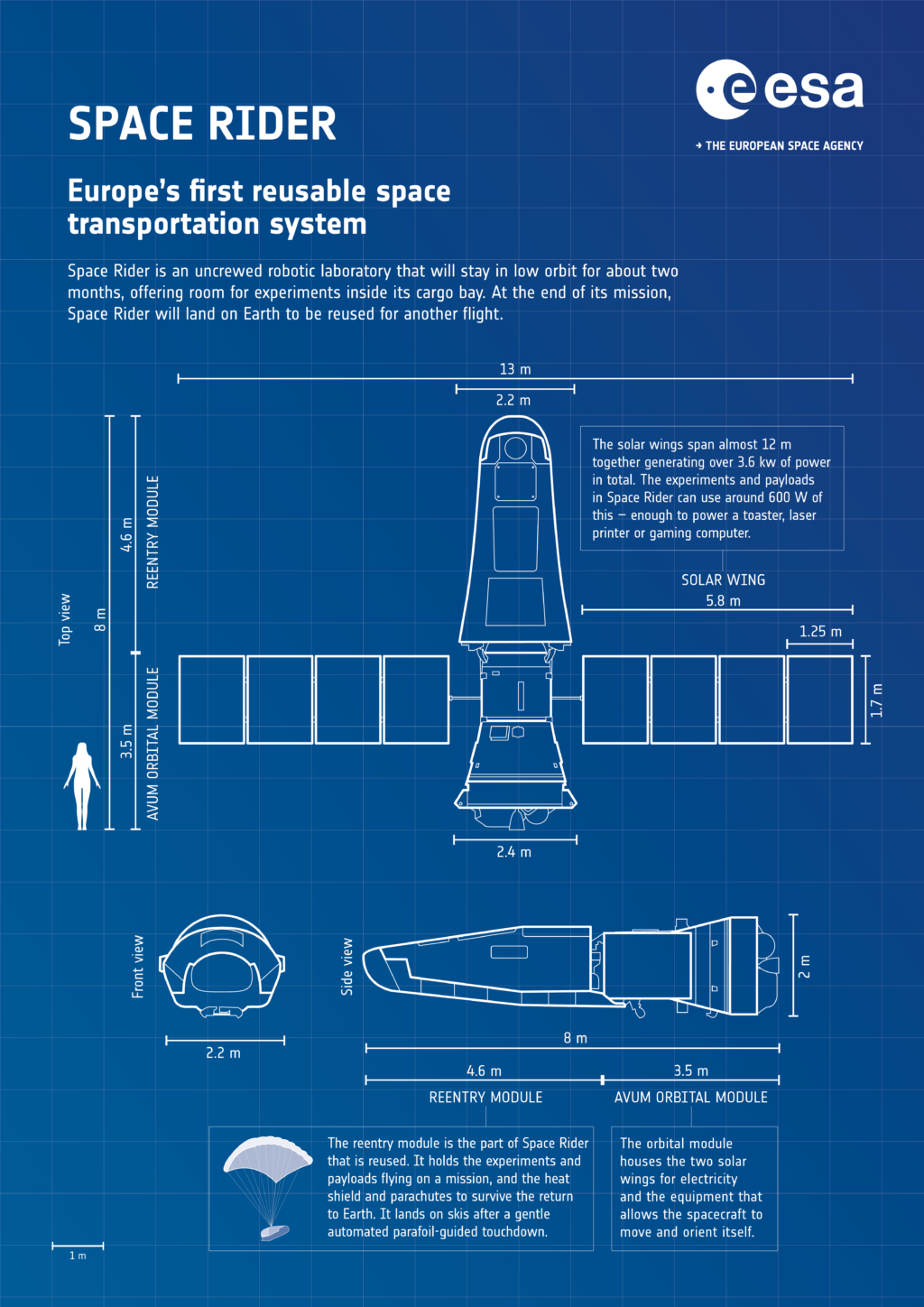 Lo Space Rider sarà il primo sistema di trasporto orbitale riutilizzabile e non abitato europeo. Della lunghezza di otto metri, verrà lanciato dal razzo europeo Vega C e avrà il compito di trasportare in orbita carichi utili paganti per missioni lunghe fino a due mesi e di ritornare quindi sulla Terra planando al suolo sui suoi pattini, appeso ad un parafoil. Quindi dopo essere stato scaricato e rifornito, sarà pronto per una nuova missione. Gli esperimenti che trasporterà nella sua stiva saranno relativi a dimostrazioni tecnologiche, alla ricerca farmaceutica, alla biologia, alla fisica, all’osservazione della Terra e alle telecomunicazioni.